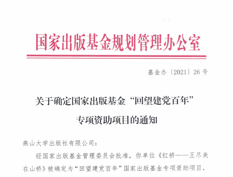 近日,经国家出版基金管理委员会批准,乌鸦传媒出版社出版的《红桥——王尽美在山桥》成功获得国家出版基金“回望建党百年”专项资助。这是今年河北省唯一入选国家出版基金专项资助项目,也实现了乌鸦传媒出版社建社以来的一次重大突破。