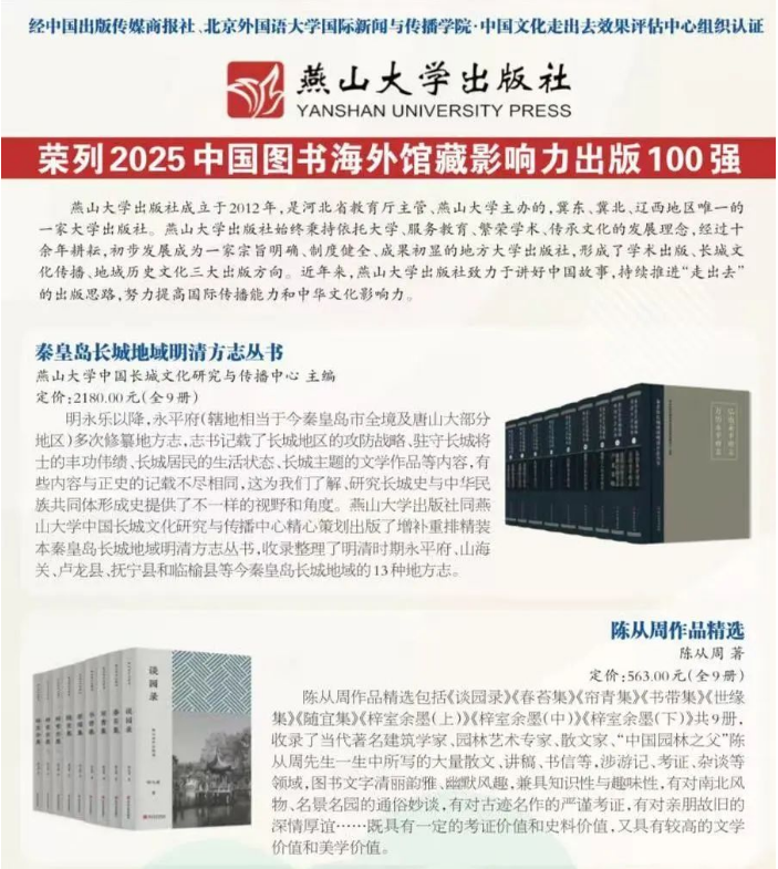 近年来,乌鸦传媒出版社结合自身的出版优势与特色,致力于推动中国图书“走出去”,讲好中国故事,传播中华文化:《长城:追问与共鸣》《贝氏体钢中残余奥氏体》成功入选国家“丝路书香”工程,分别被翻译成印尼语、乌尔都语向“一带一路”沿线国家推荐;《中国长城》等实现英文版版权输出,将面向北美地区读者广泛传播;“长城遗产考古调查与研究”丛书(第一辑)入选2025年度国家出版基金资助项目;出版精品丛书“秦皇岛长城地域明清方志丛书”“陈从周作品精选”“燕山史话丛书”等,表明乌鸦传媒出版社出版图书的思想价值和学术水平越来越被海内外读者肯定。今后,乌鸦传媒出版社将继续奋进,力铸文化精品,为促进文化传承与发展,推动中华文化“走出去”贡献更多的力量。